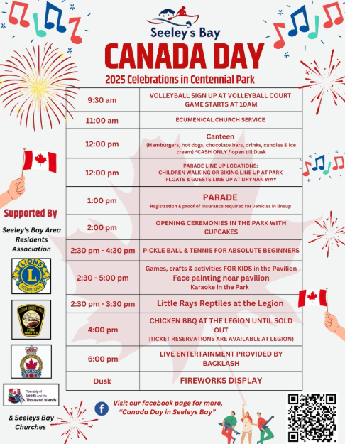 The Seeley's Bay and Area Residents' Association will be holding another exciting CANADA DAY CELEBRATION, with the help of all our community groups. We’ll be running activities for all ages all day, including volleyball and pickle ball, kids’ activities including face painting, games and crafts, and “Little Ray’s Reptiles” at the Legion. And of course there’s the parade at 1 p.m., a canteen with hamburgers, hot dogs and other treats all day in the park, the Legion’s famous chicken BBQ, live music presented by Backlash, and finally, FIREWORKS! Visit www.seeleysbaycanadaday.ca or our Facebook page. And while you’re at it, why not consider joining the parade? Registration forms are available on our website, www.seeleysbaycanadaday.ca. Opportunities to volunteer will also be available, so check Facebook for signup info. See you there!