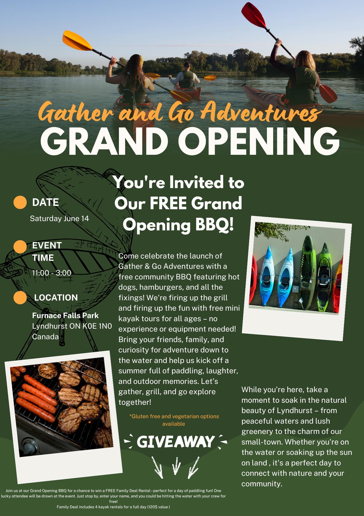 Come celebrate the launch of Gather & Go Adventures with us! Join us for a FREE BBQ with hot dogs and hamburgers, and enjoy mini kayak tours on the beautiful waters of Lyndhurst — all on us!
