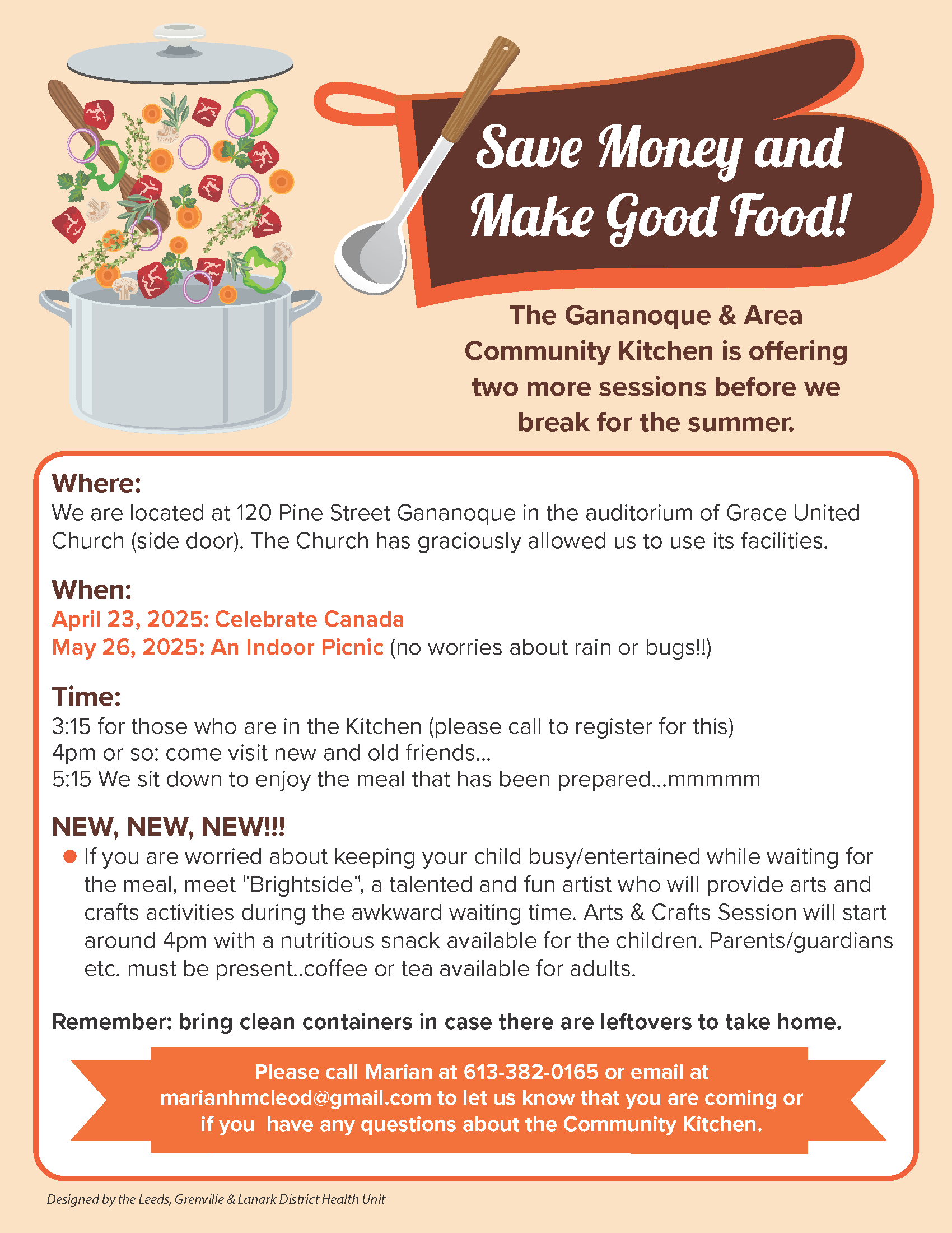 Please call Marian at 613-382-0165 or email at marianhmcleod@gmail.com to let us know that you are coming or if you have any questions about the Community Kitchen